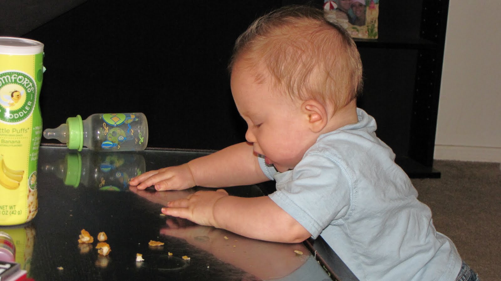 Milestones: Crawling!! That the newest and most recent! He also pulls up on everything and will sometimes 'monkey crawl' on the coffee table. He waves every now and then and learned how to make noise by wiggling his fingers in front of his mouth.